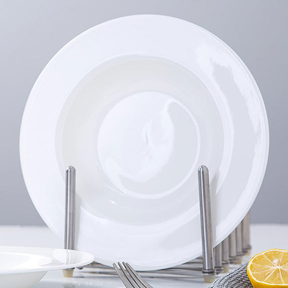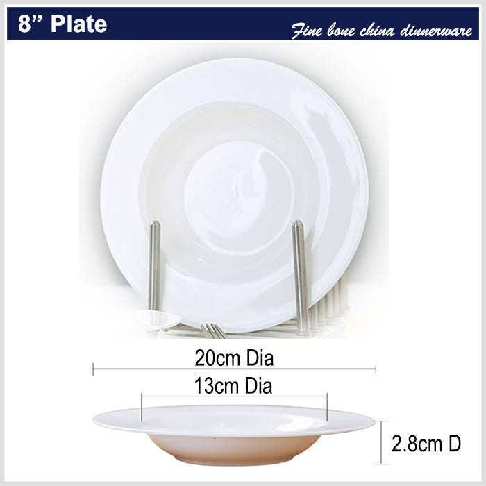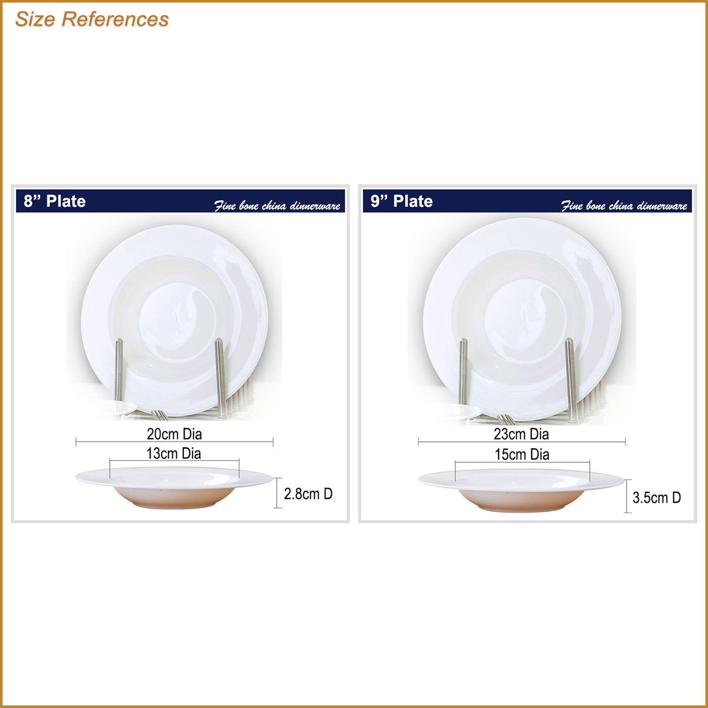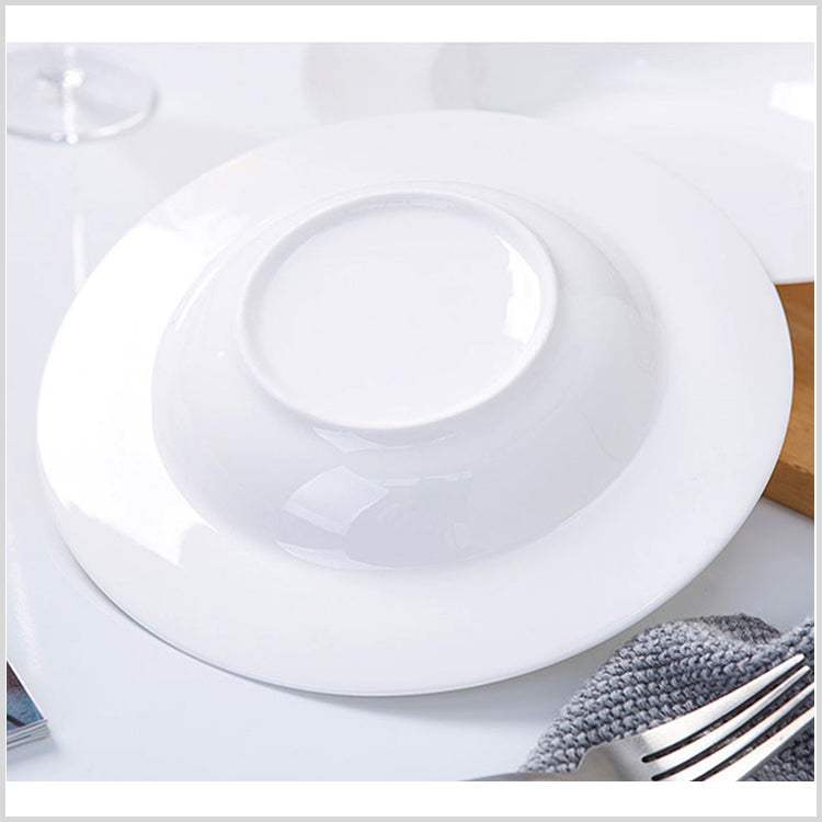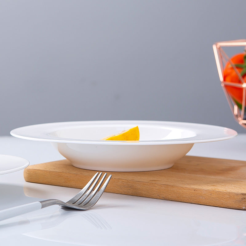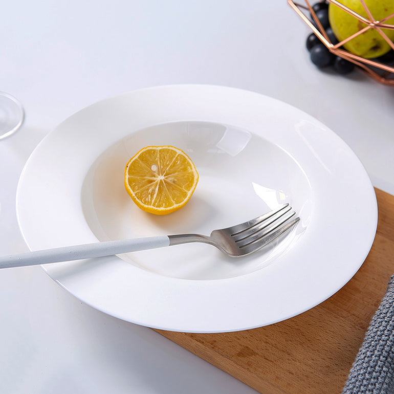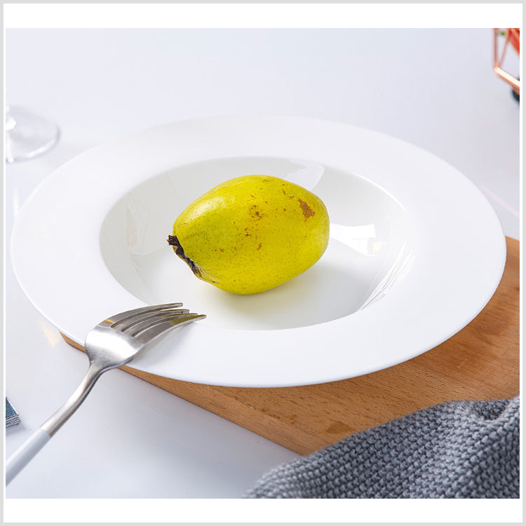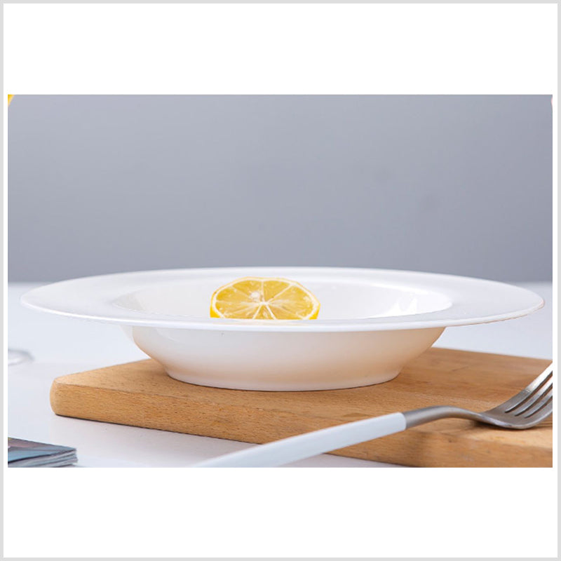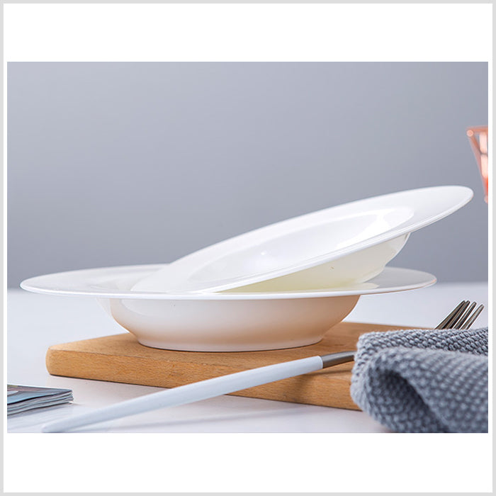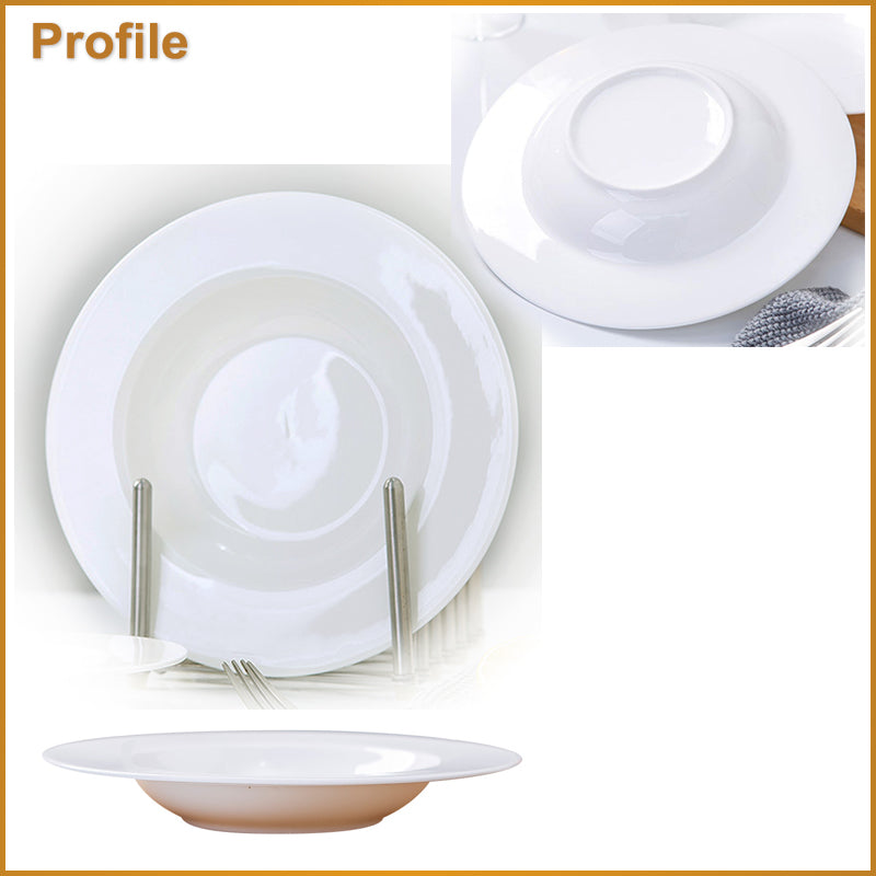 A fine bone china "straw hat" plate in creamy white. It has concave surface inwards - see the "Profile" image showing the front, back and side views (the deepth may vary for this model in different sizes)