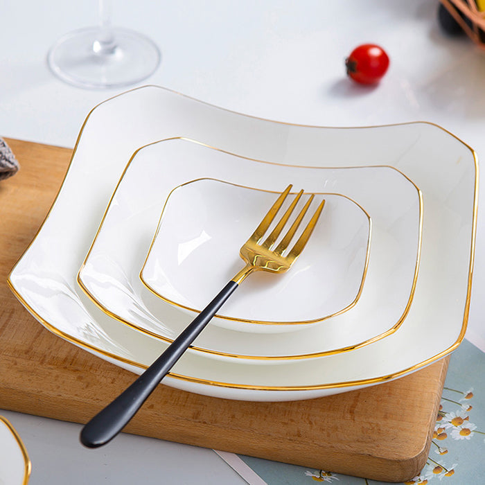 A fine bone china octagon plate in white, with gold rim, in side view the edge is curved with upward angles - see the "Profile" image showing the front, back and side views (the deepth may vary for this model in different sizes)