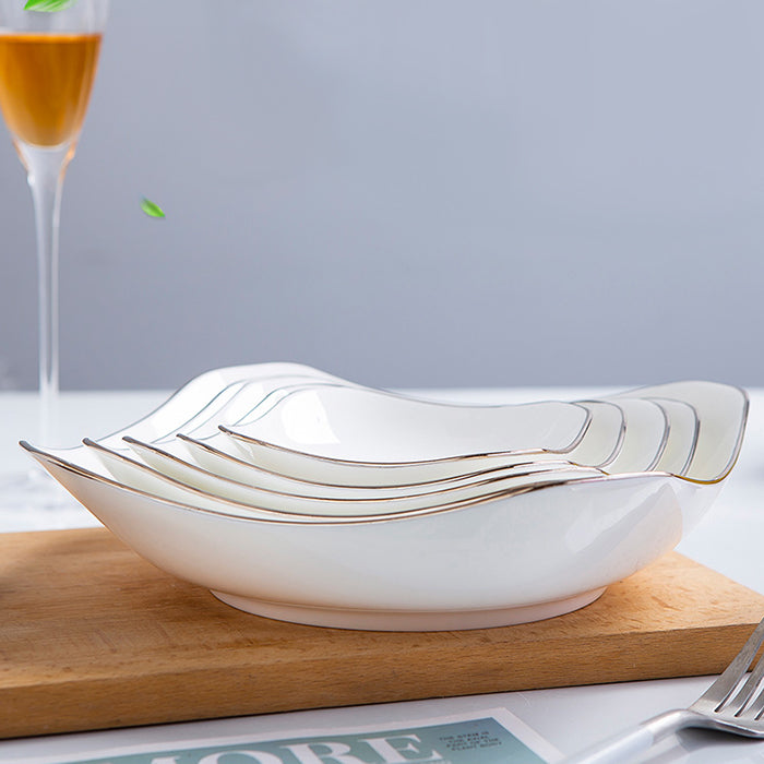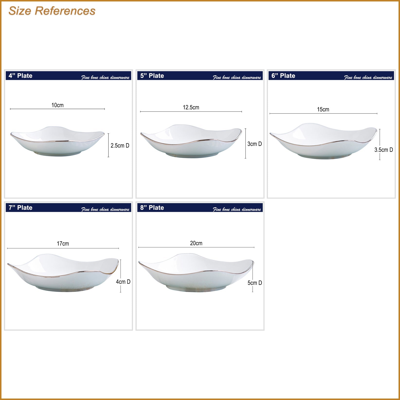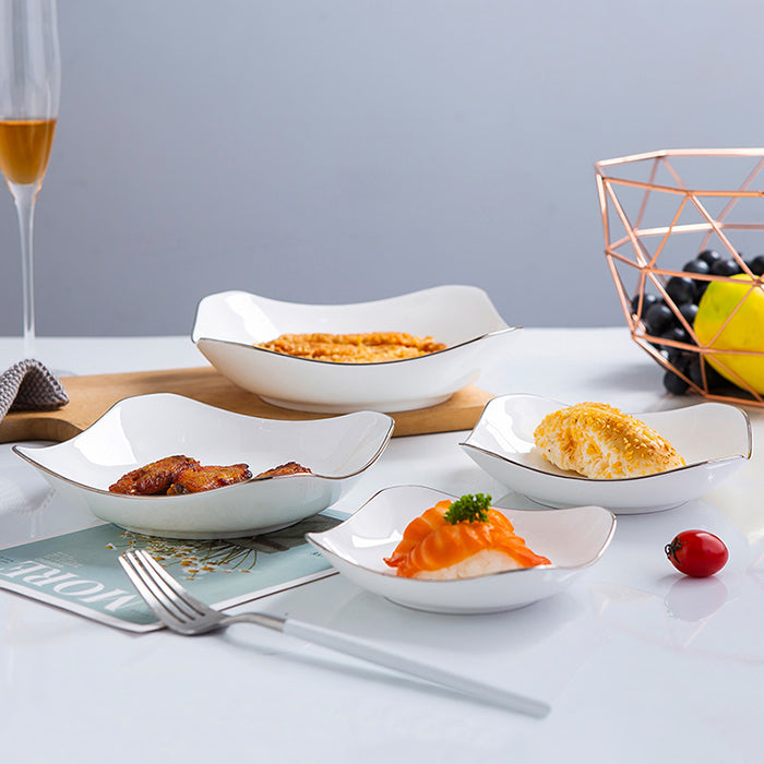 A fine bone china octagon plate in white, with silver rim, in side view the edge is curved with upward angles - see the "Profile" image showing the front, back and side views (the deepth may vary for this model in different sizes)