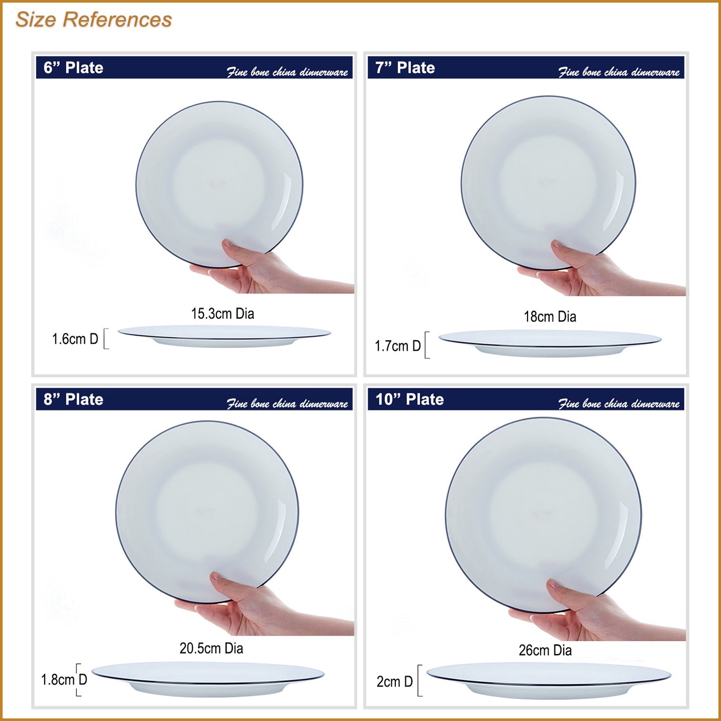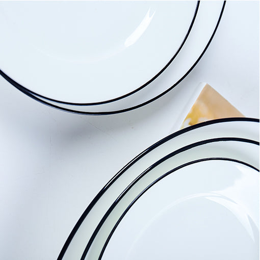A fine bone china round plate in white, with black rim - see the "Profile" image showing the front, back and side views (the deepth may vary for this model in different sizes)