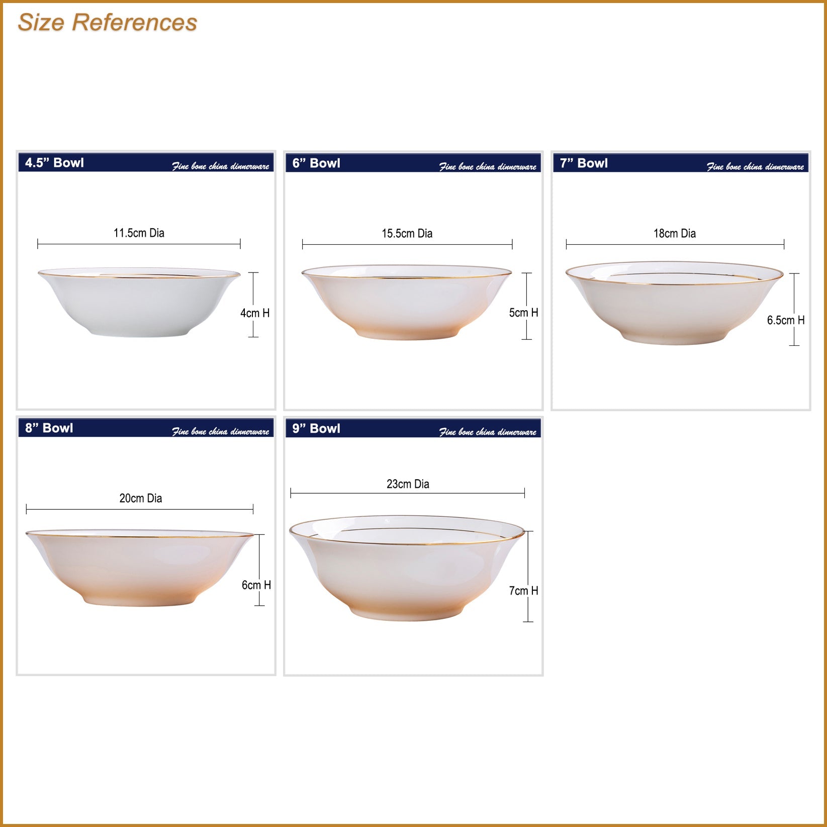 A fine bone china serving bowl in white with wide mouth, the bowl is gold rimmed - see the "Profile" image showing the front, back and side views (the height may vary for this model in different sizes)