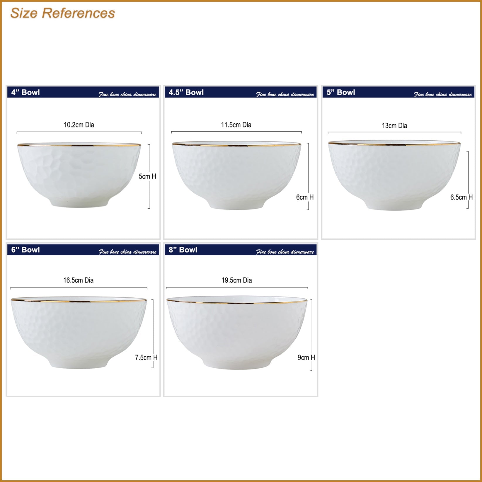 A fine bone china bowl in white, with gold rim on golf shaped surface - see the "Profile" image showing the front, back and side views (the height may vary for this model in different sizes)