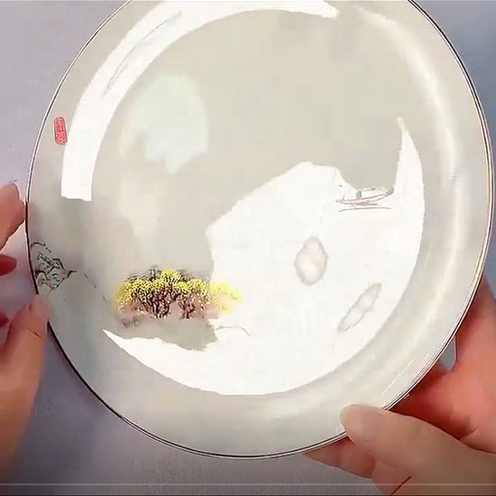This fine bone china dinnerware set has the embossed gold rim and enameled painting of landscape motif that is specicially burned in oven, presenting concave and convex sense on surface