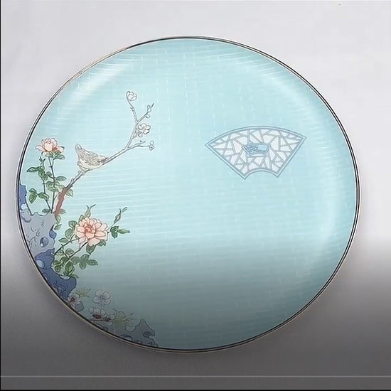 This fine bone china dinnerware set has the embossed gold leaf that outlines the floral motif enameled painting in baby blue background, presenting concave and convex sense on surface