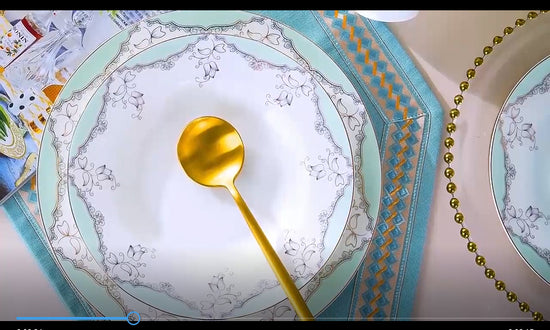 This fine bone china dinnerware set has the motif of decorative pattern in pale blue with gold rim, presenting an elegant sense in tone