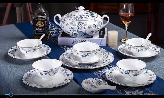 Bone China Dinnerware Set - Peacock & Floral Motif in Blue