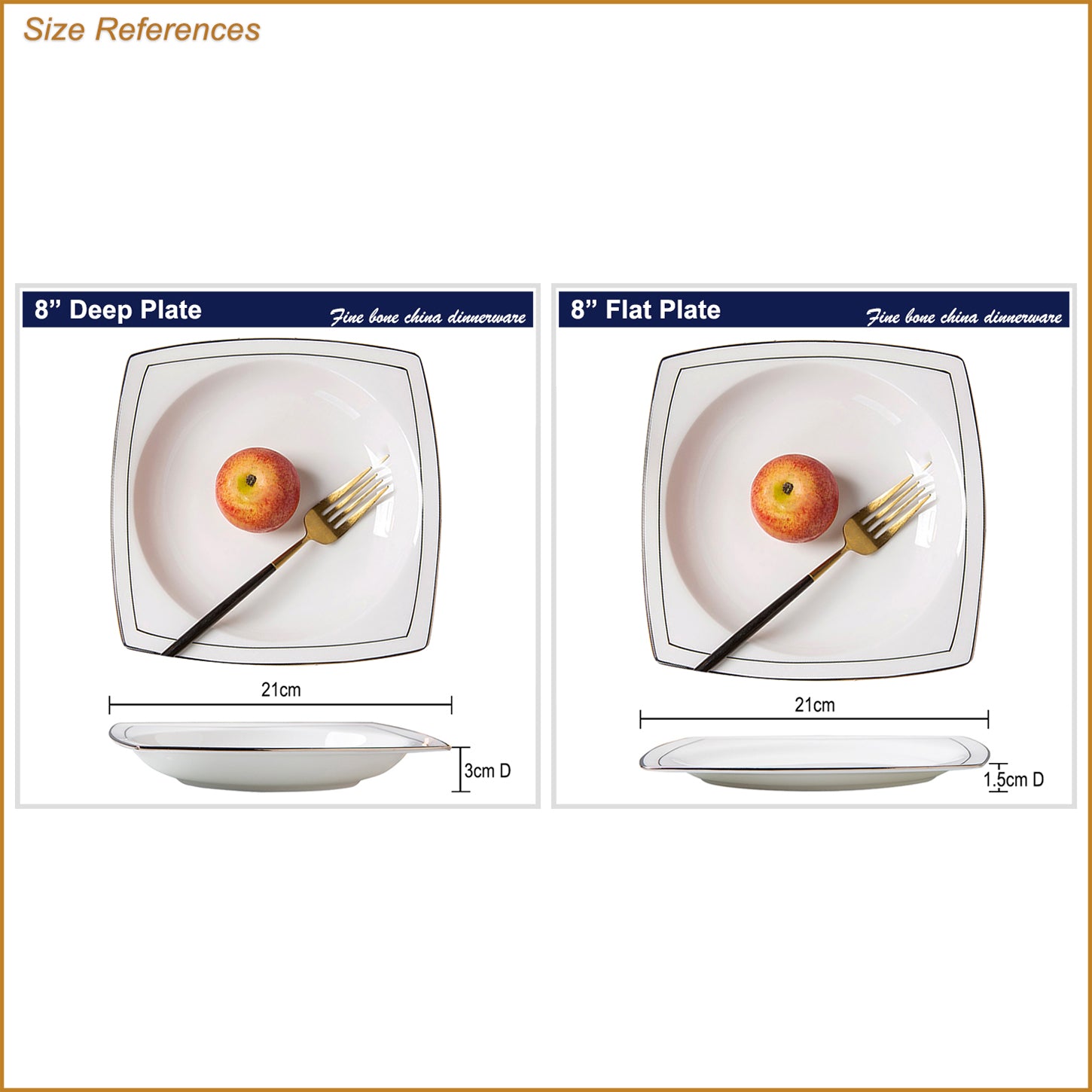 A fine bone china plate in white, with silver rim. It is square in shape with concave circle inwards - see the "Profile" image showing the front, back and side views