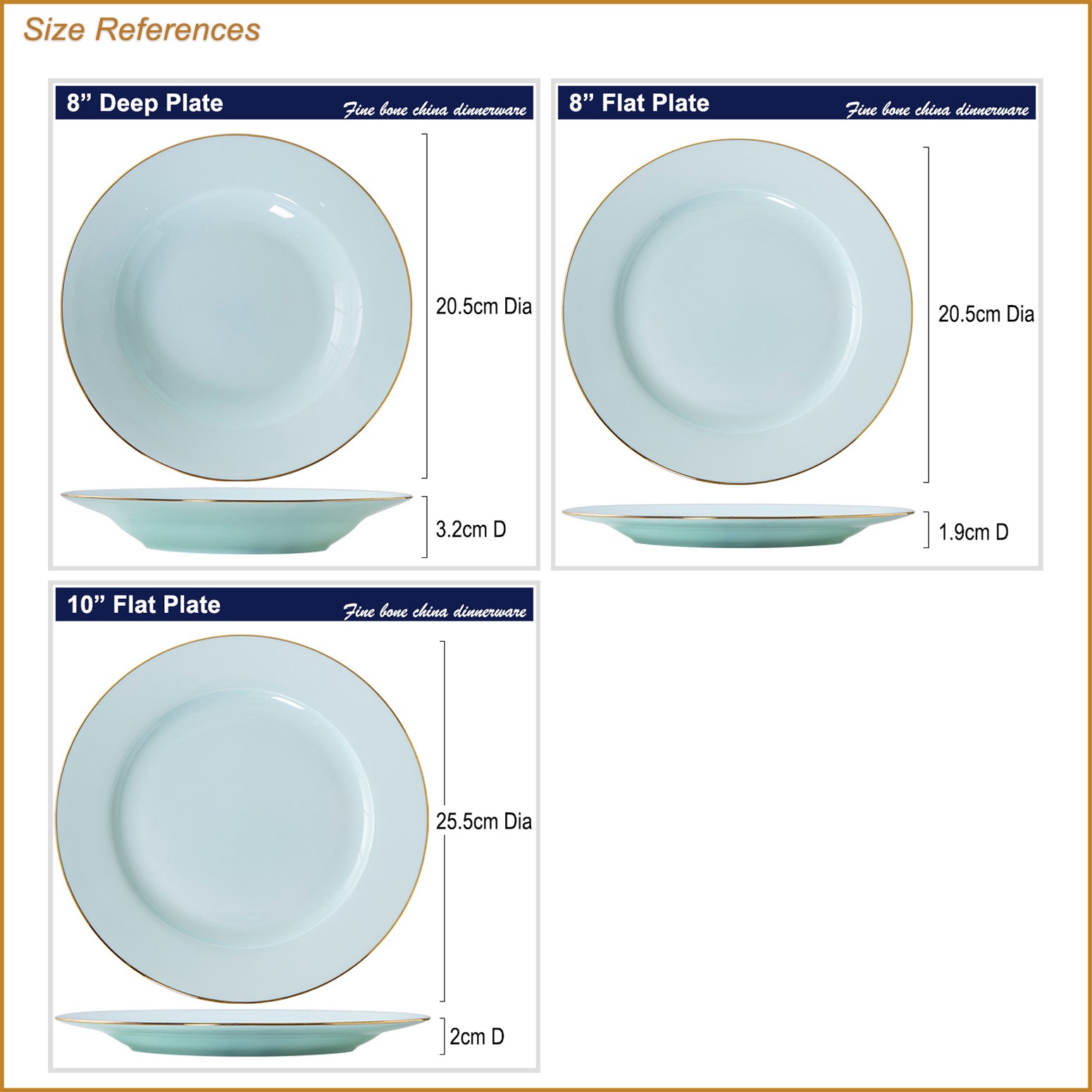 A fine bone china celadon plate with gold rim - see the "Profile" image showing the front, back and side views (the deepth may vary for this model in different sizes)