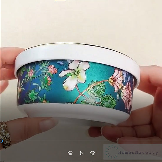 Each bowl has the enameling of colorful floral motif in rich green background and gold rim. The enameled painting is specicially burned in oven and has concave and convex sense on surface.